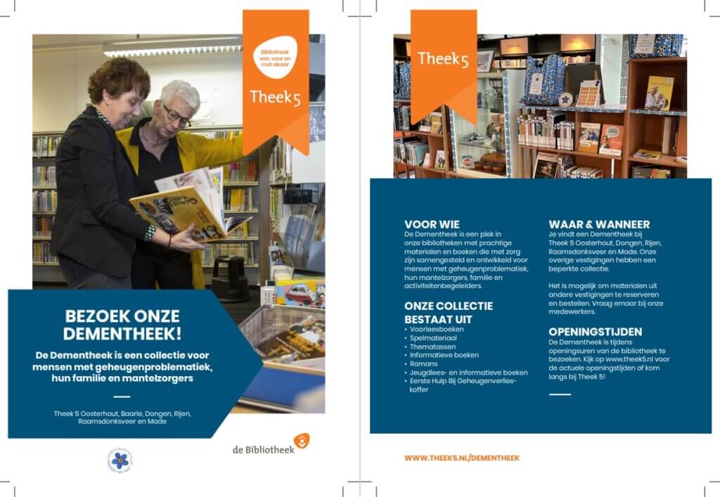 In de Gemeente Drimmelen heeft de bibliotheek een mooi initiatief voor deze dag. In de periode van 21 september tot en met 7 oktober kunnen inwoners van de Gemeente Drimmelen met geheugenproblematiek, hun familie, mantelzorgers, begeleiders en andere geïnteresseerden éénmalig een gratis thematas of ander materiaal uit de Dementheek lenen. U hoeft hiervoor geen lid te zijn van de bibliotheek Theek 5. Interesse in een gratis thematas? Neem dan tussen 21 september en 7 oktober contact op met w.vandijk@theek5.nl onder vermelding van ‘Actie Dementheek Drimmelen’.